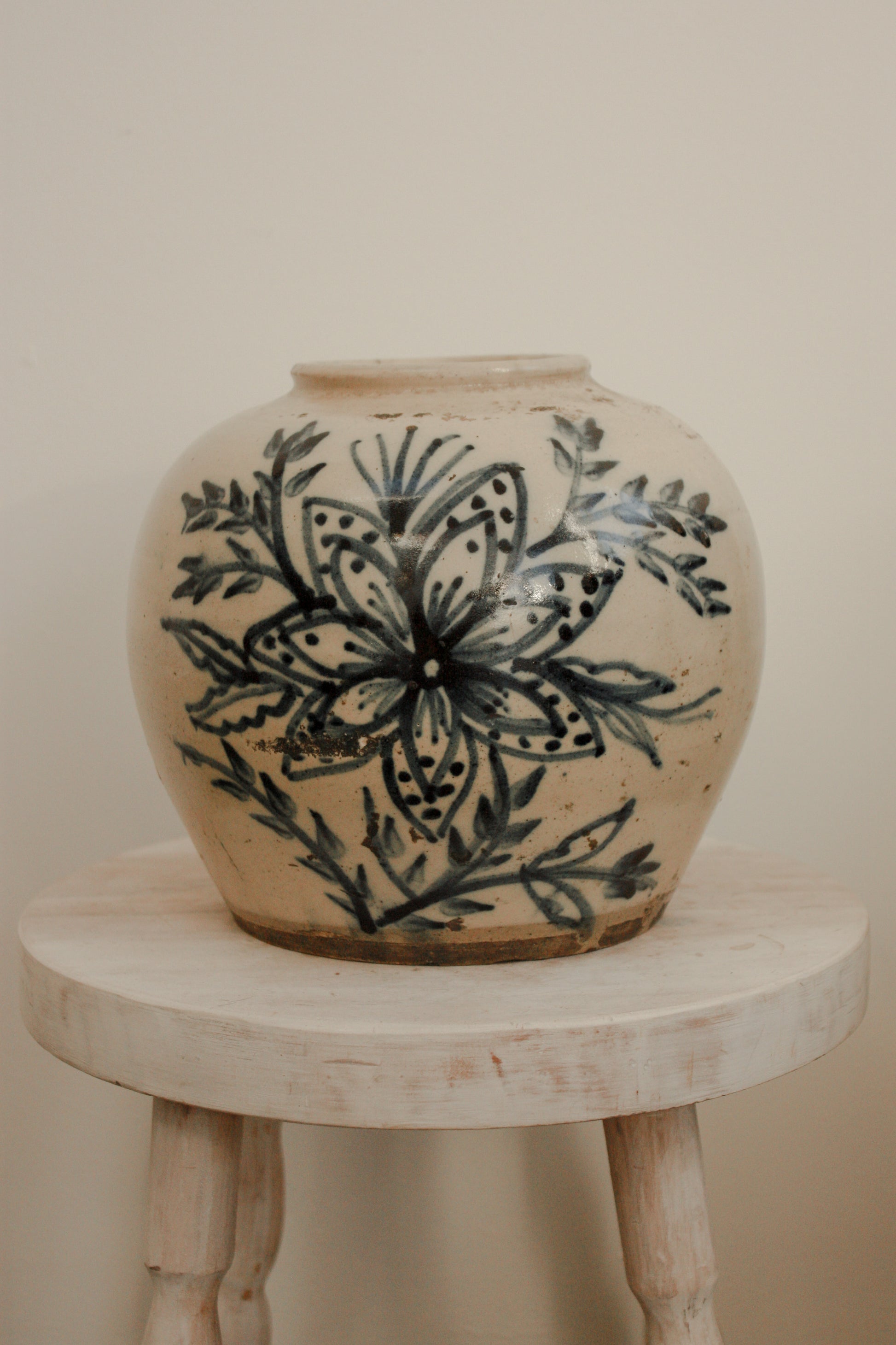Antique late 19th / early 20th century Chinese storage jar featuring a striking hand painted floral design. Each pot is a one of a kind piece with hand finished glaze - beautiful on open shelving as a standalone piece, or as part of the collection of a ceramics connoisseur.