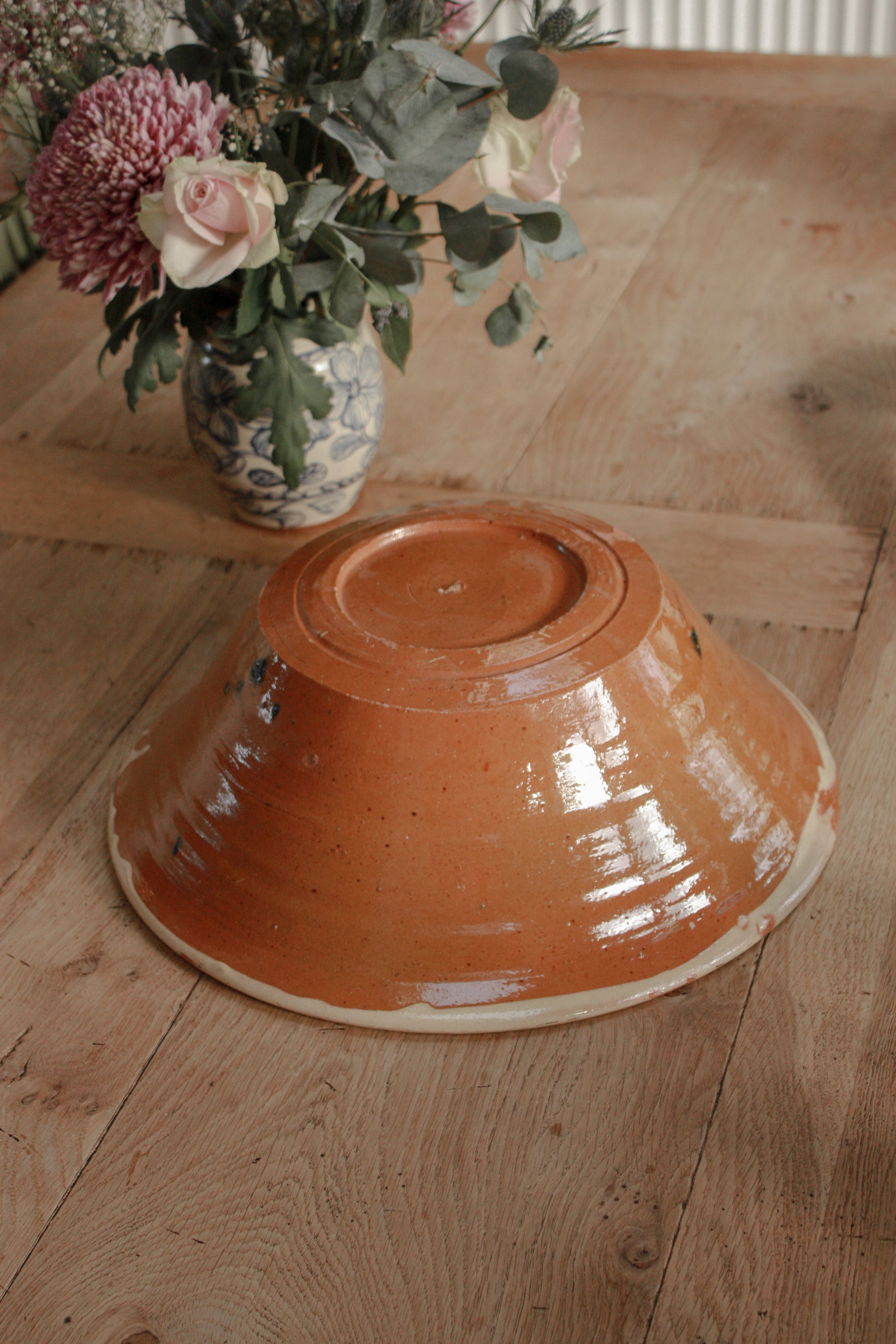 A tabletop talking point piece, this rustic antique terracotta bowl is a masterclass in colour and pattern. Bold and swooping swirls in a joyful blue and rusty plum design are set against a creamy off-white glaze that drips dreamily in places down the outside of the bowl.