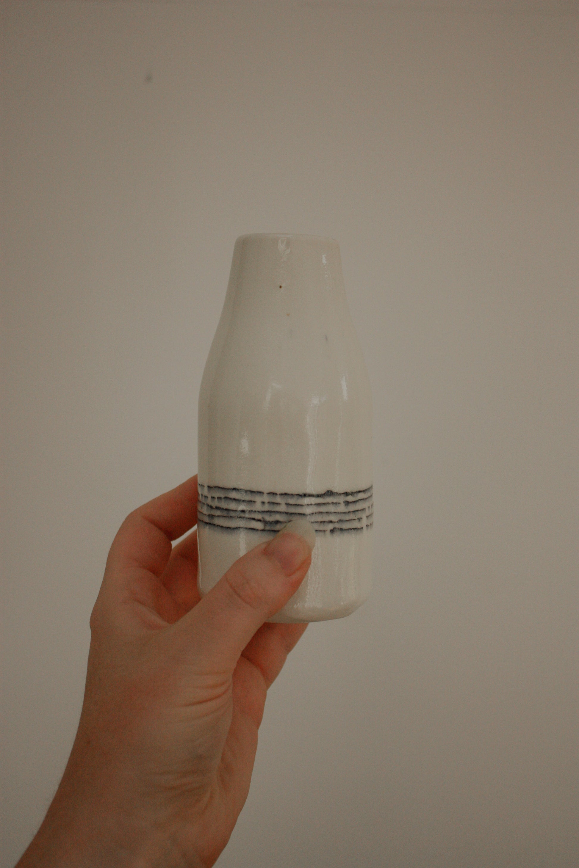 Sweet hand-formed studio art pottery milk bottle bud vase with blue and black banded design. Enjoy with a small spray of blooms for a pretty country vibe.