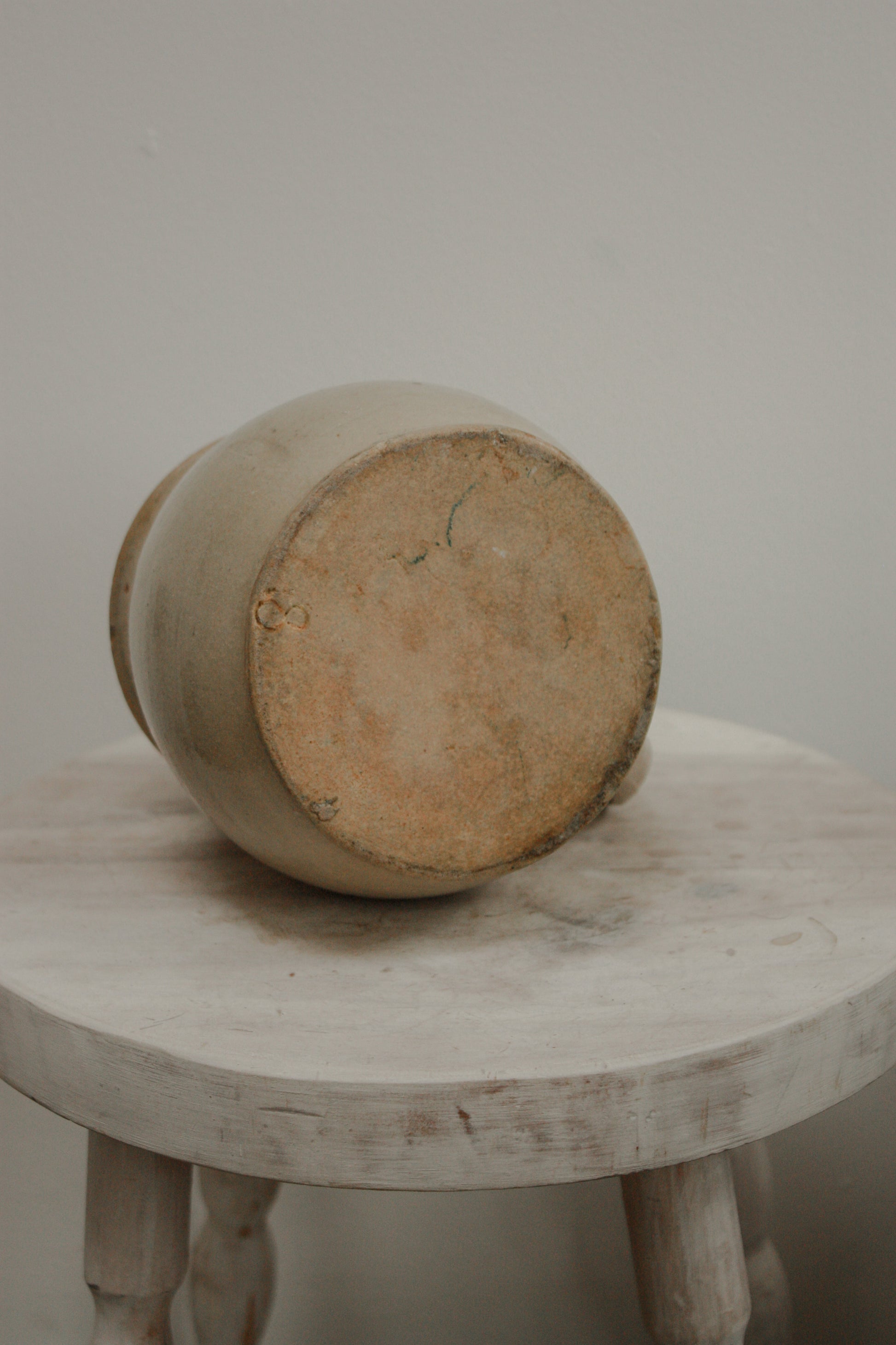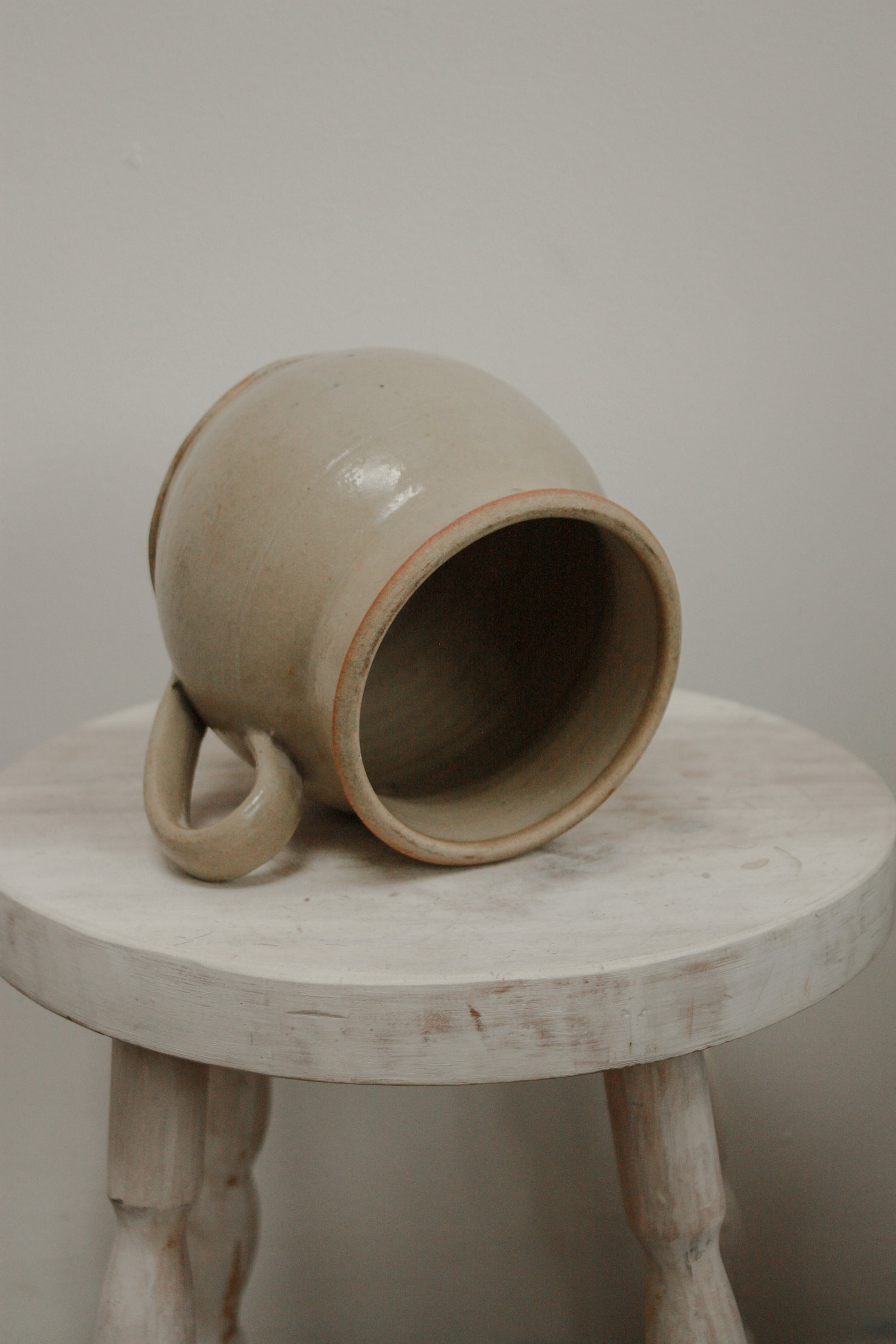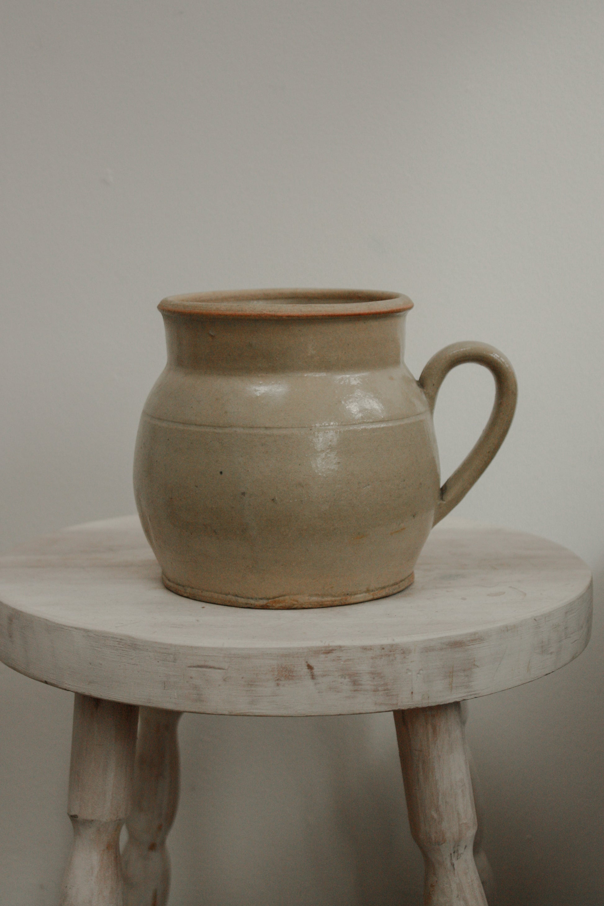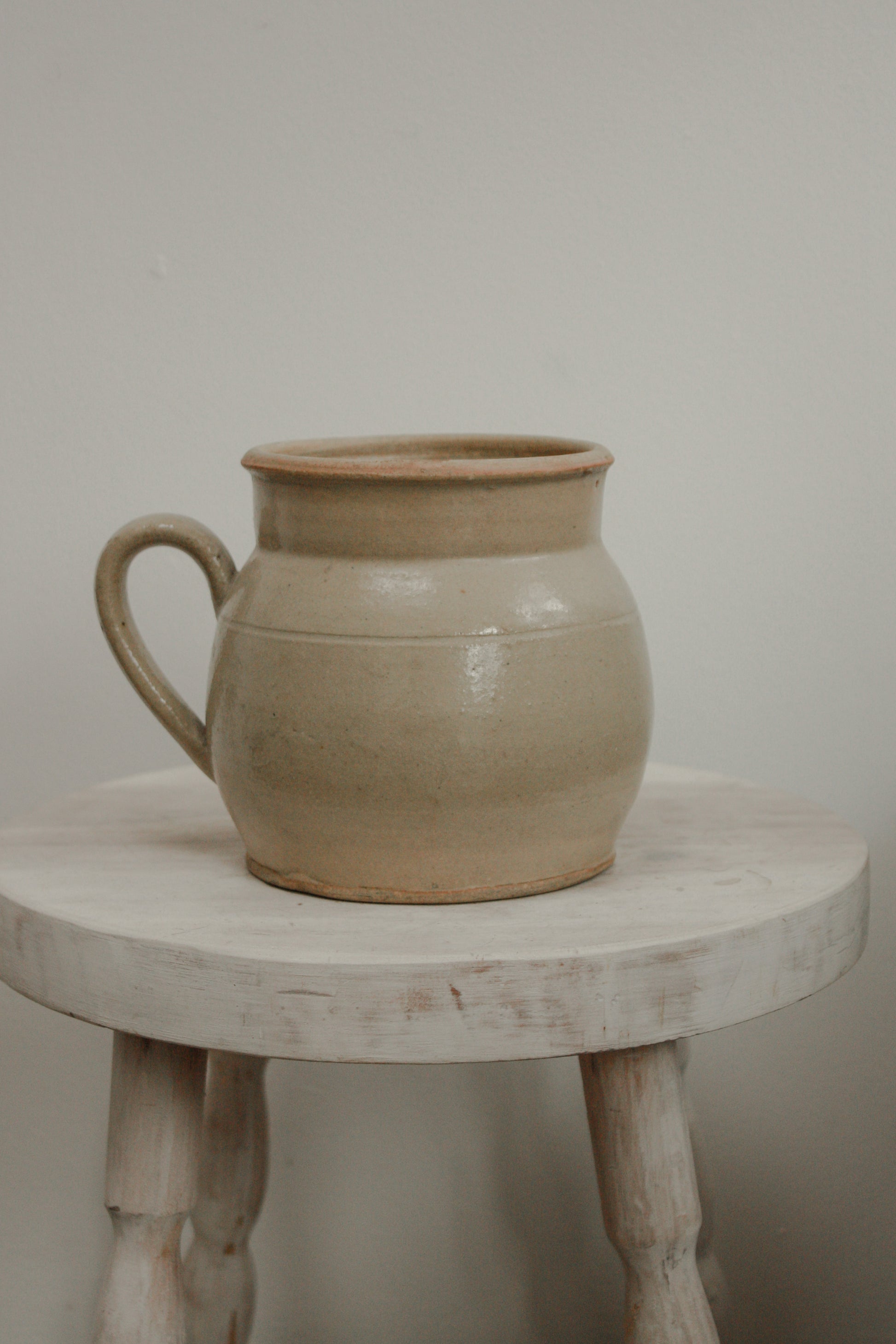 Gorgeously rustic vintage French stoneware pot with handle. Enjoy on open shelving with pots of contrasting tones and textures for a homely and layered feel.