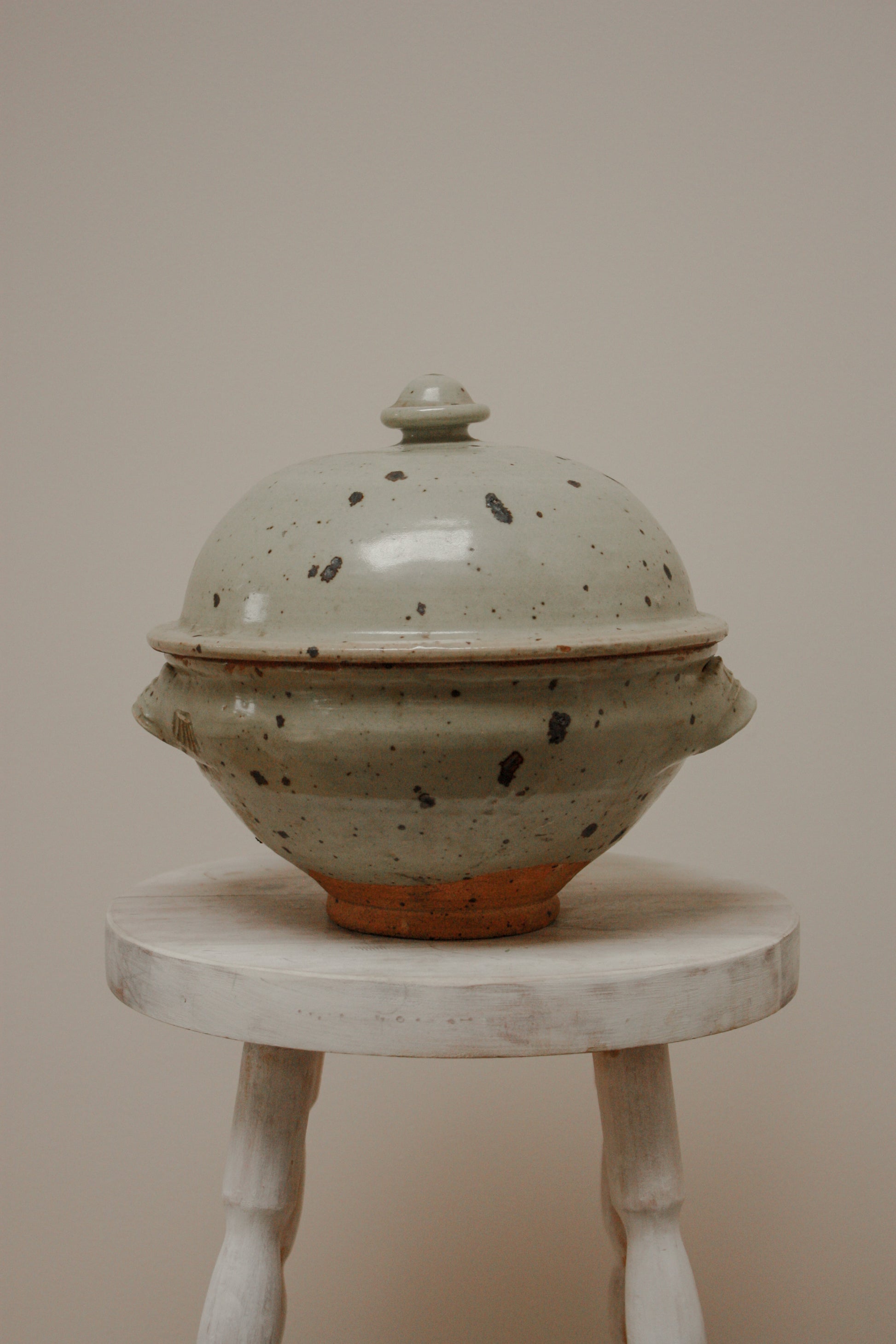 A large and technically impressive vintage French studio pottery lidded pot, salt glazed and scrumptiously speckled. Featuring a beautifully warm grey tone, this is a stunning piece for open shelving, or centrepiece for the table.