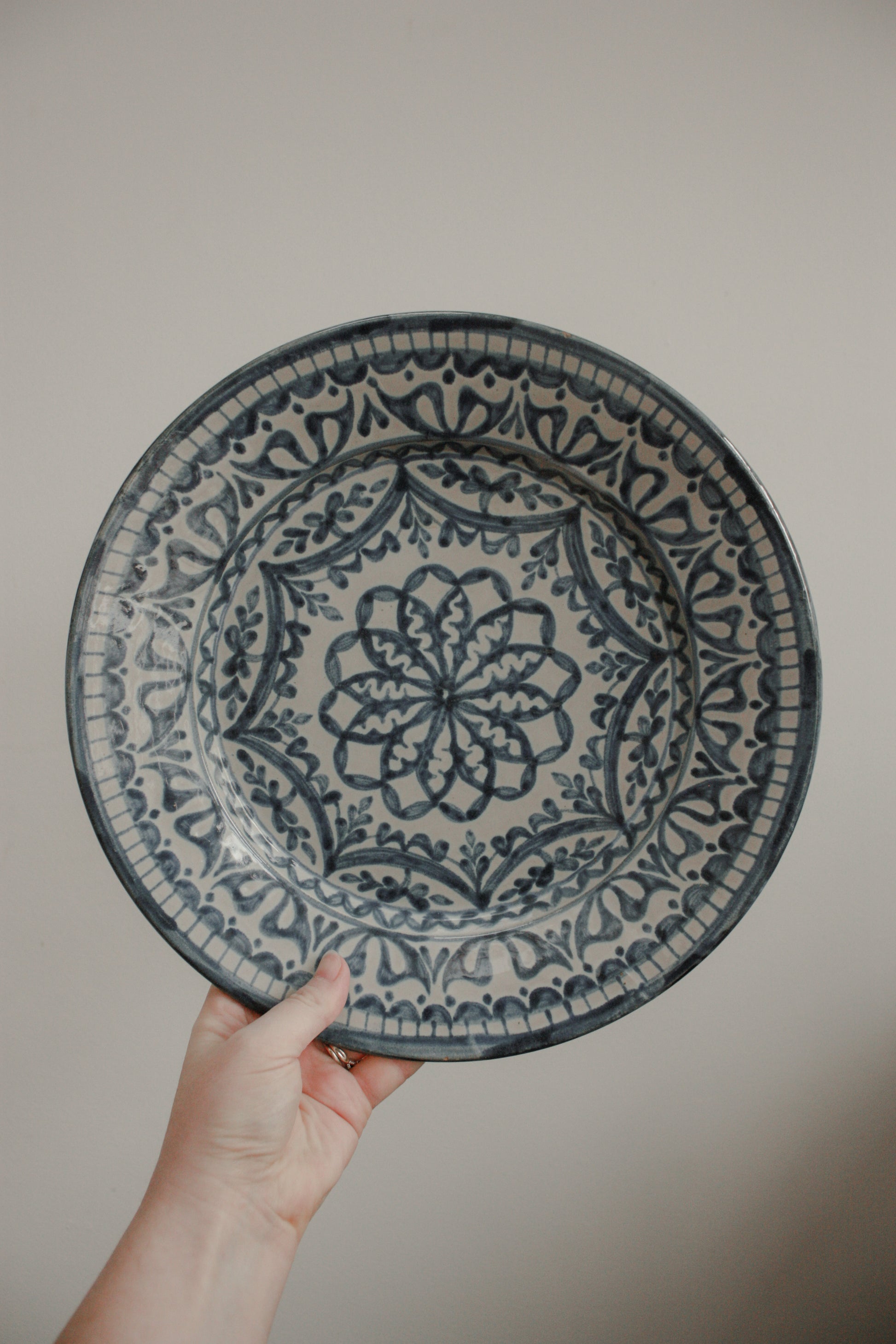 Vintage wall plate with a wonderfully detailed hand painted folk art design in a striking oxide blue.