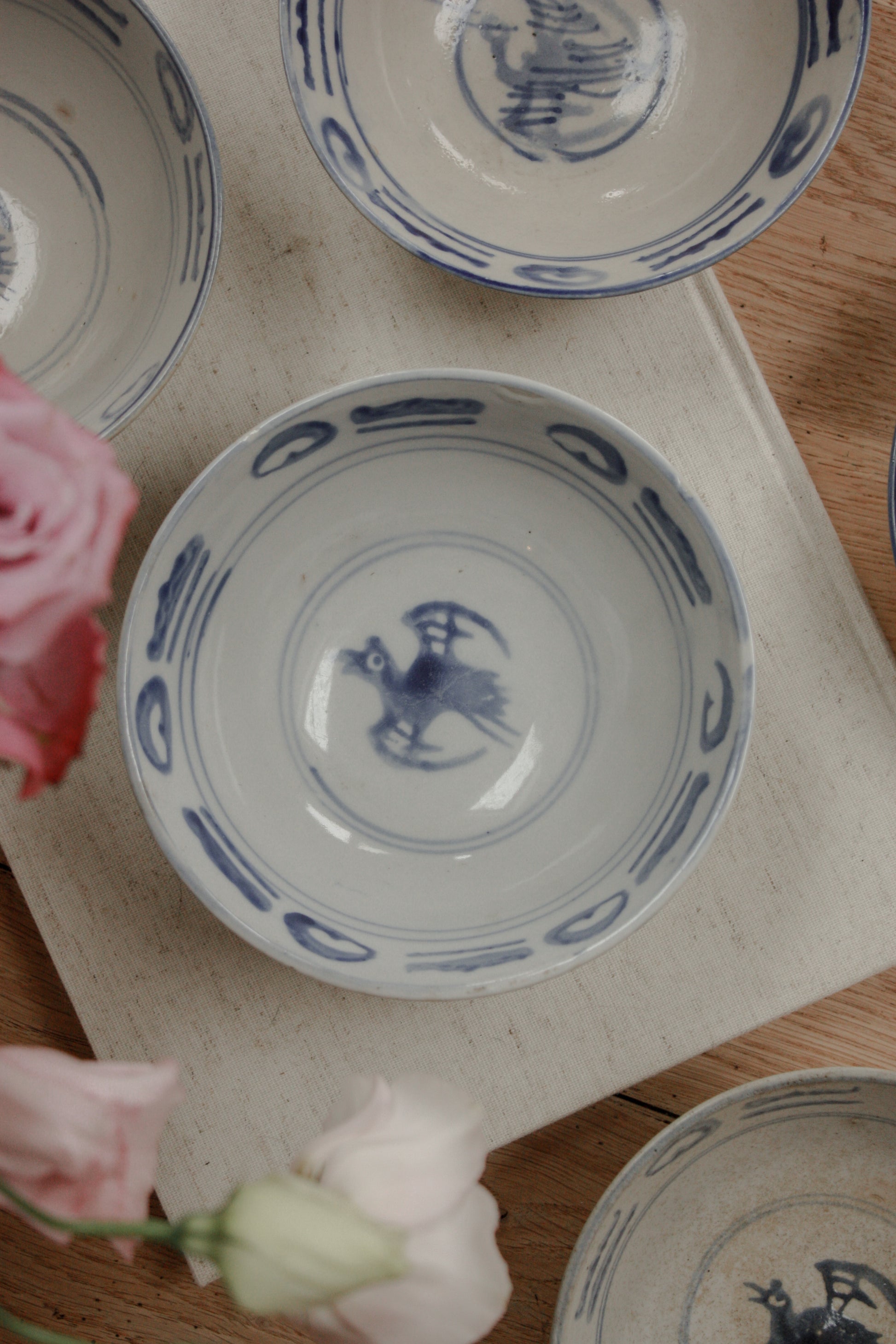 Vintage blue and white hand-painted ceramic Japanese bowl with abstract bird design.
