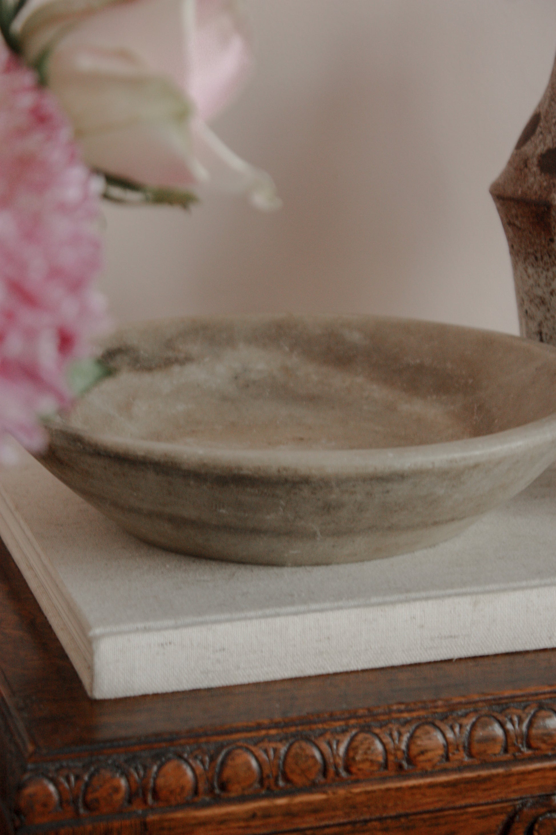 Vintage solid marble bowl with a beautiful grain and lovely rustic tones. This is a heavy piece of stone, carved by hand into bowl form and originally used to serve food in the family home.