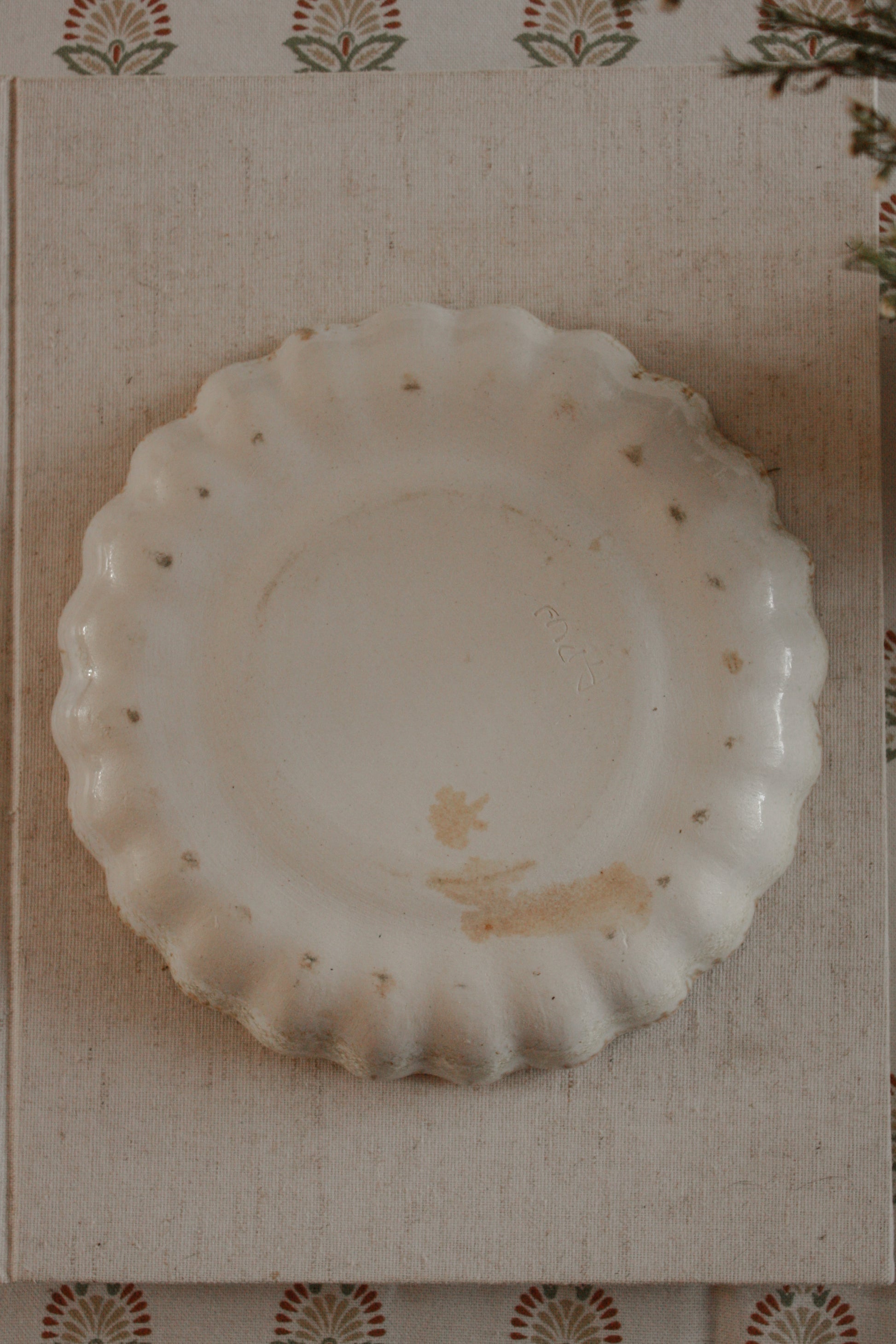 A wonderfully rustic studio pottery scalloped dish in off-white and warm olive tones. Enjoy as a jewellery catch all on the bedside or a candle drip tray on the coffee table.