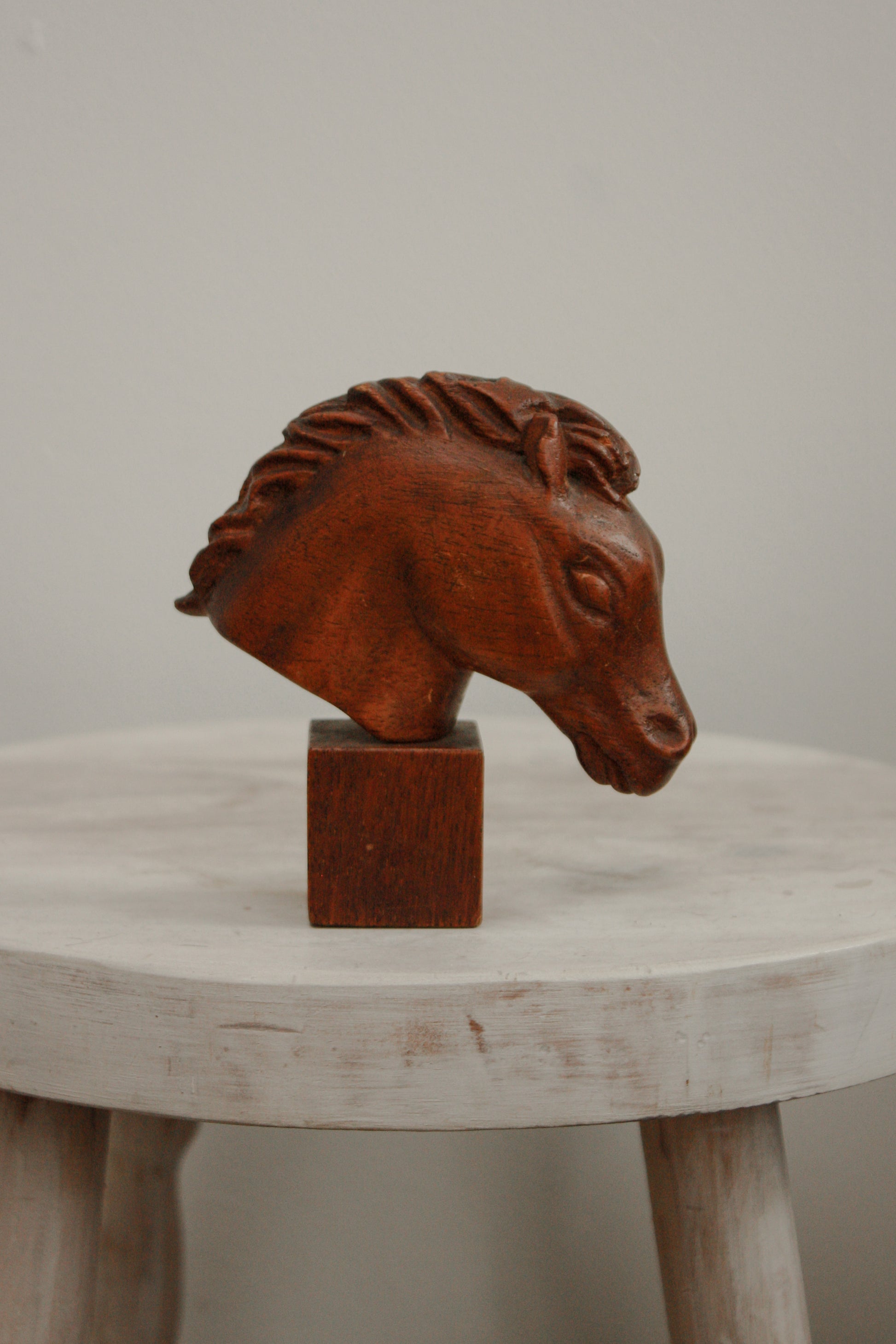 Vintage hand carved wooden horse head sculpture, mounted atop a small wooden plinth. This is a striking piece when displayed on open shelving.